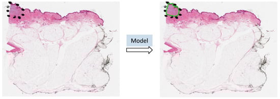 Benefiting from AI technology and histopathological images, we developed a deep neural network-based ROI detection method that could precisely detect the ROI in melanocytic skin tumors through WSIs and, at the same time, classify the slides accurately. In Figure 1, the slides have an ROI indicated by black dots. Our goal was to automatically find this region without the use of black dots. The performance of our model could be seen as the green boundary in the right panel. Large images were broken into small patches and we extracted abundant features from these patches [23,24,25,26,27]. In addition, we leveraged the partial information from annotations, also called “semi-supervised learning”, to enhance our model detection method. This method improved classification accuracy compared to previous approaches for certain kinds of tumors. Also, we proved our algorithm’s accuracy and robustness by decreasing our training samples to various subsets of the original training samples. Figure 2 illustrates an overview of our method.