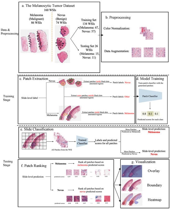 An overview of the proposed detection framework. (a) The Melanocytic Tumor Dataset randomly assigned 80% (134 WSIs) of the data as the training set and 20% (26 WSIs) of the data as the testing set. (b) Preprocessing: color normalization [28,29] and data augmentation. (c) Extract melanoma, nevus and other patches from training data. (d) Model trained a 3-class patch classifier based on extracted patches. (e) For each slide, slide classification generated predicted scores for all patches and calculated patch and slide classification accuracy. (f) All patches from a slide were ranked based on the corresponding predicted scores in the context of melanoma or nevus, depending on the slide classification result. (g) Visualization results based on predicted scores.