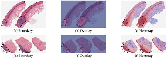 The detection methods could provide three types of visualization maps: boundary, overlap and heatmap. (The overlap map highlights the top-ranked patches in a WSI while masking other areas with a transparent blue color. The percentage of highlighted patches corresponds to , the annotated ratio. Therefore, the highlighted region represents the predicted ROI. This visualization helps in identifying the most significant areas that the model considers as part of the ROI. The boundary map delineates the boundary of the largest ROI cluster based on the highlighted patches. The highlighted patches are clustered using the OPTICS algorithm, which effectively groups the patches into meaningful clusters. This map provides a clear visual representation of the boundaries of the detected ROI, aiding in the assessment of the model’s precision in identifying tumor margins. The heatmap uses a color gradient to indicate the predicted scores, with red regions representing high predicted scores and blue regions representing low predicted scores. This visualization allows for an intuitive understanding of the model’s confidence in different regions of the WSI, highlighting areas with high likelihoods of being part of the ROI.) Three visualization maps are generated based on the predicted scores calculated in the ROI detection section (Figure 2g). The overlap map highlights top-ranked patches in a WSI and masks other areas with a transparent blue color (Figure 3a,d). The percentage of highlighted patches equals (the annotated ratio). Therefore, the highlighted region is also the predicted ROI. The boundary map shows the boundary of the largest ROI cluster based on the highlighted patches, where the highlighted patches are clustered by the OPTICS algorithm [30] (Figure 3b,e). The last one is a heatmap where red covers regions that have high predicted scores and blue covers regions that have low predicted scores (Figure 3c,f).