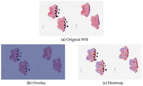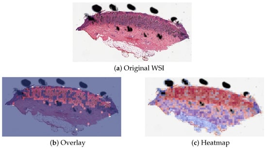 Some recent studies have also examined tumors by using deep learning architecture in the medical imaging field [13,14,15,16,33]. Most literature mainly studied the effects of CNN-based methods on different cancers like breast cancer and skin cancer and achieved high accuracy on the classification task. The main difference between our model and those CNN-based models is that our model surpasses the state-of-the-art (SOTA) performance of the CLAM model. Our approach achieves higher accuracy in dealing with medical images, particularly in the context of melanocytic skin tumors, demonstrating superior performance in both detection and classification tasks. In addition to CNN-based methods, we have also included recent research focusing on Transformer models, which have demonstrated powerful learning capabilities in various medical image enhancement tasks. For instance, Feng et al. [34] introduced an end-to-end task Transformer network (T2Net) that allows feature representations to be shared and transferred between MRI reconstruction and super-resolution tasks. Similarly, Wang et al. [35] introduced the Transformer-based TED-net for low-dose CT (LDCT) denoising. TED-net is an encoder–decoder dilation network free of convolution, utilizing a symmetric U-shaped architecture with encoder–decoder blocks consisting solely of the transformer. Khalid et al. [36] utilized deep learning and transfer learning to classify skin cancers. Some literature [37,38] tried to solve the classification problem in breast cancer by deep learning methods. In addition, Farahmand et al. [6] not only classified the WSI accurately, but they also focused on ROI detection tasks and achieved nice results. From Lu et al. [31], CLAM was used to solve the detection of renal cell carcinoma and lung cancer. CLAM is proposed to accomplish slide classification and ROI detection, which does not require pixel- or patch-level labels. However, when applied to the Melanocytic Skin Tumor Dataset, the ROI detection of this method is not satisfactory. Lerousseau et al. [39] introduced a weakly supervised framework (WMIL) for WSI segmentation that relies on slide-level labels. Pseudolabels for patches were generated during training based on predicted scores. Their proposed framework has been evaluated on multi-locations and multi-centric public data, which demonstrates a potentially promising approach for us to further study WSIs.