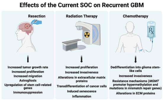Effects of the current standard of care on recurrent glioblastoma. Primary effects of resection, radiation therapy, and chemotherapy on recurrent GBM. Created with BioRender.com.