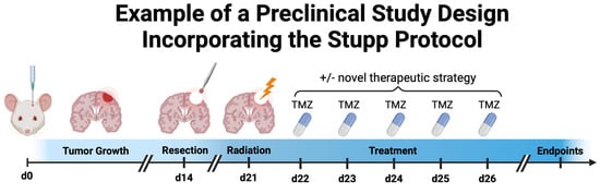 Traditionally, novel GBM treatments are screened in preclinical models using treatment-naïve intracranial tumors [6,7]. This approach, however, does not mirror clinical practice, where patients with newly diagnosed GBM undergo resection surgery, followed by RT and chemotherapy. Unfortunately, more than half of patients present with recurring tumors within only six months after surgery [8]. A growing body of evidence indicates that recurrent tumors frequently exhibit unique mutations and subtype alterations compared to primary tumors, with many of these variations attributed to selection pressure exerted by the treatments themselves [9,10,11,12,13,14]. In the present review, we highlight the impact of each element within the SOC on the treatment timeline of GBM and the characteristics of recurrent tumors. Additionally, we provide a comprehensive overview of preclinical models integrating SOC. This approach aims to improve the identification of novel treatment strategies, bridging the gap between experimental settings and practical applications.