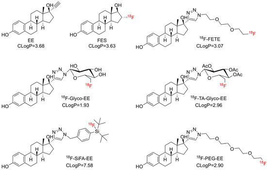 Chemical structures of FES, 18F-FETE [8], EE and derivatives thereof synthesized in this study aiming at different lipophilicity. CLogP values were calculated using the software ChemDraw, Version 19 (Revvity Signals Software, Revvity Inc., Waltham, MA, USA).