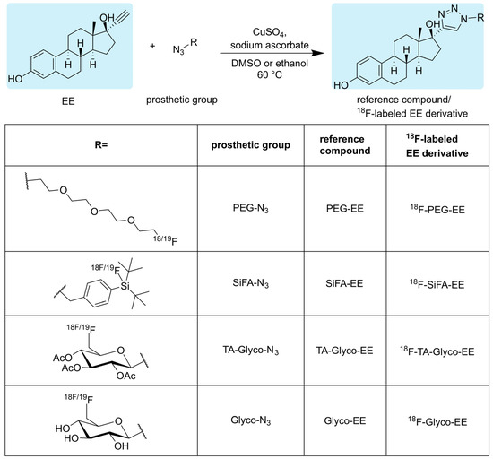Derivatization with an ethinyl group in the C17 position of E2 was reported to give 17α-ethinylestradiol (EE), which showed a higher ER affinity compared to E2, together with improved pharmacokinetic properties due to decreased first-pass hepatic extraction [18]. Further derivatization by the introduction of a triazole ring in the C17 position by Cu-catalyzed azide-alkyne cycloaddition (CuAAC; click chemistry) resulted in a varied binding affinity for ER which largely depended on the nature of the 4-substituent of the triazole ring [19]. Xu et al. showed that the derivatization of EE by a triazole moiety maintained the ER affinity and demonstrated a specific binding to ER in the case of [18F]FETE, a PEGylated triazolyl derivative (Figure 1) [8], and [125/131I]ITE2, an E2 dimer [13].
