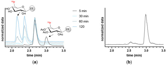 HPLC analysis of the stability of 18F-TA-Glyco-EE. (a) The stability of 18F-TA-Glyco-EE in human serum was determined after various incubation periods, indicating time-dependent cleavage of the acetyl groups. (b) The incubation of MCF-7 cells with 18F-TA-Glyco-EE for 90 min at 37 °C confirmed that intact 18F-TA-Glyco-EE was intracellularly detected, without significant deacetylation in the absence of serum.