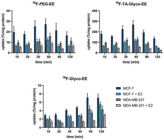 The 18F-labeled EE derivatives 18F-TA-Glyco-EE, 18F-Glyco-EE, and 18F-PEG-EE, with favorable in vitro properties and sufficient stability, were further evaluated in cellular uptake experiments. The human breast adenocarcinoma cell line MCF-7 was used as the ER+ control, whereas the human breast carcinoma cell line MDA-MB-231 was used as the ER− control [25]. The cells were incubated for a maximum of 120 min with the respective radiotracer in the absence or presence of E2 (72 µM) as a blocking reagent to determine non-specific (ER-independent) tracer uptake (Figure 4). All radioligands exhibited specific ER-dependent uptake in ER+ cells at 60–90 min of incubation that was blocked in the presence of E2 to the level of ER− cells. However, a relatively high amount of non-specific uptake in ER− cells was observed that could be further blocked by the addition of E2. Furthermore, the radiotracers clearly showed a time-dependent total uptake in both ER+ and ER− cells. The most hydrophilic compound, 18F-Glyco-EE, showed a minimal total uptake steadily ascending over time to reach 7%/mg after 90 min, as well as the lowest specific uptake compared to 18F-PEG-EE and 18F-TA-Glyco-EE. 18F-PEG-EE, on the other hand, showed a four times higher total uptake (27%/mg after 60 min), in addition to a higher specific uptake compared to 18F-Glyco-EE. In comparison to 18F-PEG-EE and 18F-Glyco-EE, 18F-TA-Glyco-EE showed a 10-fold higher uptake and thus the highest specific uptake in ER+ cells (270%/mg after 60 min). Based on these results, 18F-TA-Glyco-EE was used as a radioligand for further in vitro and in vivo studies.
