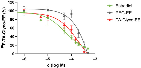 Competitive cellular uptake experiments were performed in ER+ MCF-7 cells at 37 °C for 60 min, using 18F-TA-Glyco-EE as a radioligand and increasing concentrations of E2 or EE derivatives as competitors (Figure 5). The competitive cellular uptake elucidated the findings of the cellular uptake assay. Only at high concentrations of the competitors was the uptake of 18F-TA-Glyco-EE completely diminished, which may be due to various transport mechanisms, including passive transport [28]. In the specific assay set up in this work, IC50 values of 56 µM (E2), 194 µM (TA-Glyco-EE) and 1274 µM (PEG-EE) were determined for the inhibition of cellular uptake of 18F-TA-Glyco-EE in MCF-7 cells (Figure 5).