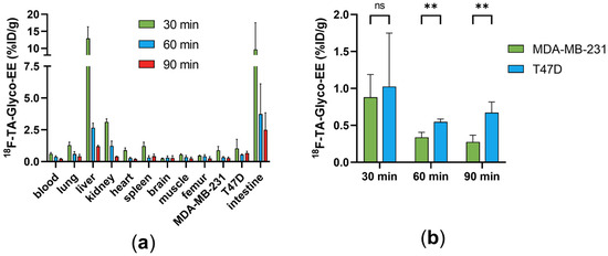 (a) Biodistribution of 18F-TA-Glyco-EE in T47D (ER+) and MDA-MB-231 (ER−) tumor-bearing nude mice at 30, 60 and 90 min p.i. Data are expressed in %ID/g as mean values ± SD from three animals per group (n = 3–4). (b) Statistical comparison of the mean 18F-TA-Glyco-EE uptake in ER+ and ER− tumors by multiple t-test calculations (ns: not significant (p > 0.05), ** p (60 min) = 0.002, ** p (90 min) = 0.003).