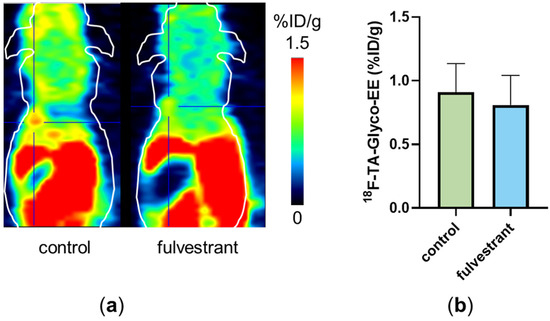 (a) Small animal PET scan of a single MCF-7 (ER+) tumor-bearing nude mouse injected with 18F-TA-Glyco-EE (control, 60 min p.i.). After the first scan, the same mouse received fulvestrant (0.5 mg s.c.), and 48 h later, the 18F-TA-Glyco-EE-PET was performed again (“fulvestrant”, 60 min p.i.). The tumor is marked by the crosshair. (b) Analysis of tumor uptake of 18F-TA-Glyco-EE at 60 min p.i. in MCF-7 (ER+) tumor-bearing nude mice (“control”) compared to fulvestrant-pretreated mice (“fulvestrant”). Data are expressed as mean values (in %ID/g) ± standard deviation, each n = 4.