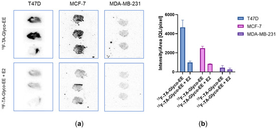 (a) In vitro autoradiography of T47D, MCF-7 and MDA-MB-231 tumor slices incubated with either 18F-TA-Glyco-EE or 18F-TA-Glyco-EE together with E2 (72 µM) for 60 min. (b) Analysis of 18F-TA-Glyco-EE binding to tumor slices. Data are expressed as mean values of the intensity per area ± SD from 3–4 slices of each group.