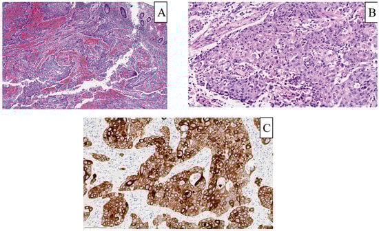 Sample pathology from a patient within the cohort with final pathology of poorly differentiated carcinoma with squamous differentiation. (A) Low power view (scale bar, 500 µm) showing irregular nests of tumor and little evidence of gland formation or mucin production. (B) High power view (scale bar, 100 µm) showing more prominent features of squamous differentiation, such as intra-cellular bridges. (C) Immunohistochemical staining for high molecular weight keratin showing diffuse positive staining indicative of squamous differentiation.