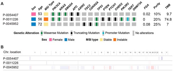 Genetic profile of 3 patients with MSK-IMPACT, highlighting specific mutations affecting selected oncogenes and tumor-suppressor genes (A) and chromosome location (B). (MSI = microsatellite instability, FGA = fraction of genome altered by copy number changes, and TMB = tumor mutational burden).