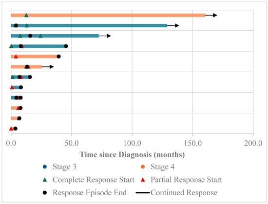 Swimmer’s plot of Stage III and IV adenosquamous carcinoma (ASC) patients in the cohort, highlighting the frequency of recurrences within the cohort.