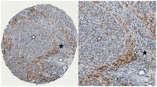 Example of immunohistochemistry expression of CD4+ cells in two different compartments in LSCC: The intratumoral epithelial compartment with iCD4+ cells (tumor cell nests marked with a white asterisk), and intratumoral stromal compartment with sCD4+ cells (marked with a black asterisk). (left): 100× magnification; (right): 300× magnification (iCD4+: intratumoral; sCD4+: stromal).