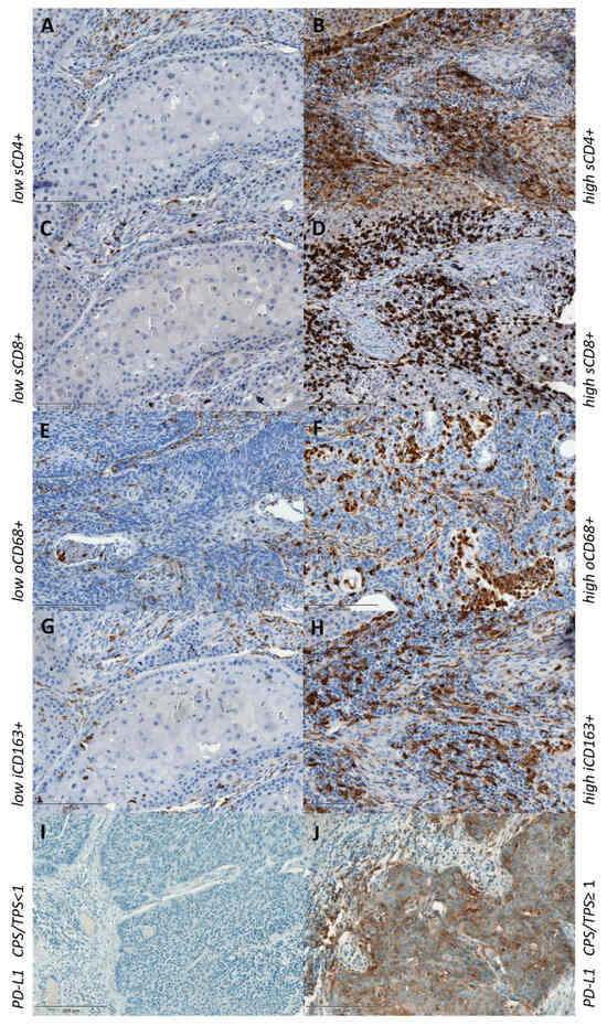 Low and high expression of immunohistochemical staining of CD4+ (A,B), CD8+ (C,D), CD68+ (E,F), CD163+ (G,H) and PD-L1-negative and -positive CPS/TPS (I,J). s—stromal; o—overall; i—intratumoral.
