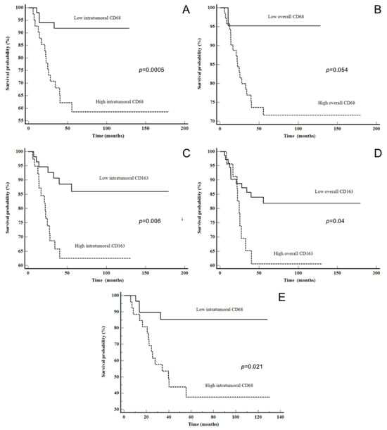 Disease-specific survival: (A) CD68 intratumoral in all LSCC patients, (B) CD68 overall in all LSCC patients, (C) CD163 intratumoral in all LSCC patients, (D) CD163 overall in all LSCC patients and (E) CD68 intratumoral in advanced stage LSCC.