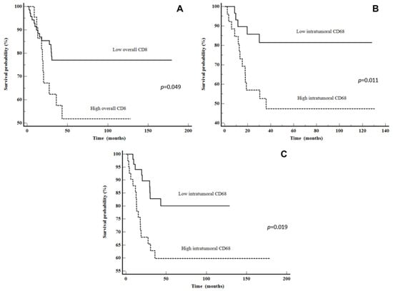 A receiver operating characteristic (ROC) curve was generated to evaluate the efficacy of CD4, CD8, CD68 and CD163 (intratumoral, stromal and overall) as biomarkers for predicting patient outcomes and determining the most effective statistical cut-off values. Hence, the ROC curve and Youden index were computed to optimize the sensitivity and specificity of the individual marker in predicting the overall disease-specific survival in the univariate model. The AUC (area under the ROC curve) was calculated to assess the prediction model’s quality, along with a 95% confidence interval (CI). ROC analysis showed statistically significant cut-off values of >2.7% for CD68 intratumoral (p = 0.004, AUC = 0.702), >5.5% for CD68 overall (p = 0.042, AUC = 0.644) and >2% for CD163 intratumoral (p = 0.01, AUC = 0.689). Disease-specific survival (DSS) was expressed as the number of months from diagnosis to the occurrence of a disease-related death. Disease-free survival (DFS) was defined as the time interval from the date of diagnosis to the date of the first documented recurrence of disease. If there was no recurrence, disease-free survival was determined as the date of last follow-up.