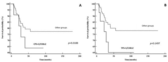 Disease-specific survival: (A) PD-L1−CD8 low vs. other groups (PD-L1+CD8 high, PD-L1+CD8 low and PD-L1−CD8 high) using CPS for PD-L1 expression; (B) PD-L1−CD8 low vs. other groups (PD-L1+CD8 high, PD-L1+CD8 low and PD-L1−CD8 high) using TPS for PD-L1 expression.