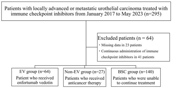 The primary endpoint of this study was to investigate the predictive factors for prolonged OS after EV treatment initiation. All enrolled patients were divided into three groups, including those who received EV as a third-line therapy (EV group), those who received non-EV chemotherapy (non-EV group), and those who were unable to continue treatment for any reason (best supportive care [BSC] group). OS was evaluated in the three groups, starting at the beginning of ICI and tertiary treatments, and the efficacy of EV was examined compared with other treatments. A log-rank test for clinical parameters was used to identify predictors of all-cause mortality after the initiation of EV treatment. In addition, univariate and multivariate analyses were performed using the Cox proportional hazards model to identify factors associated with mortality after EV treatment. Regarding the Cox proportional hazards model, the determination of cutoff values was based on the AUCs. The Kruskal–Wallis test was used for continuous variables, whereas Fisher’s exact test was used for categorical variables. All statistical analyses were performed using EZR version 1.56 (Saitama Medical Center, Jichi Medical University, Saitama, Japan), a graphical user interface of R version 3.3.0 (The R Foundation for Statistical Computing, Vienna, Austria) [20].