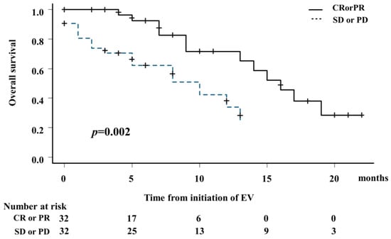 Kaplan–Meier analysis of OS by treatment response to EV. Median OS for patients with complete or partial response and stable or progressive disease after EV administration was 16 months (95% CI, 9–not applicable [NA]) and 10 months (95% CI: 5–13 months), respectively (p = 0.002).