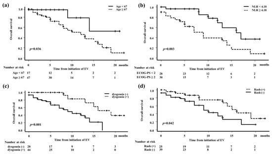 For subgroup analysis of OS, patients were divided into two groups based on ROC curves for age at the initiation of EV treatment (≥67 vs. <67 years) and NLR (≥4.18 vs. <4.18); the presence or absence of EV-related AEs such as dysgeusia and rash were also compared. A significantly longer OS was observed in patients with an age ≥67 years, NLR <4.18, dysgeusia, and rash (Figure 4).