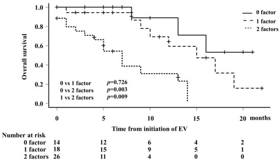 Kaplan–Meier analysis was performed in the EV group for patients who had neither of the two factors, namely neutrophil-to-lymphocyte ratio ≥4.18 and positive dysgeusia, as the 0 factor group, those who had either of the two factors as the 1 factor group, and those who had both factors as the 2 factor group. The median OS from the date of EV administration in the 0, 1, and 2 factor groups was NA (95% CI: 8–NA), 15 months (95% CI: 9–19 months), and 7 months (95% CI: 3–13 months), respectively.