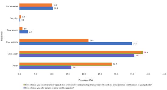 In regard to attitudes towards FP, our study shows that the majority of HCPs feel it is their responsibility to discuss the issue with their patients. This is a notable improvement to previous studies, where certain HCPs including oncology social workers, did not feel it was their initial responsibility [56,57]. Furthermore, in another study, surgeons felt that oncologists should take ownership of discussing the risks of treatment to fertility, as they had more clinical knowledge to do so [58]. Given very few HCPs refer patients for FP frequently, either due to a lack of knowledge of referral pathways or services available, they may perceive that they are the patient’s only opportunity to discuss FP prior to commencing treatment of cancer.