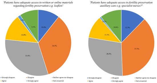 Through a number of national and international networks and societies, such as the European Society of Human Reproduction and Embryology (ESHRE), the Fertility Consortium in the USA and the International Society of Fertility Preservation, emerging evidence has demonstrated that FP methods, previously deemed experimental, such as the transplantation of ovarian tissue and administration of GnRH agonists, are effective treatments for FP in cancer patients [34,35]. However, the techniques require expertise from both reproductive specialists and oncologists, and therefore multi-disciplinary and multicentre networks are paramount in the effective implementation of services. Hence, why within our own findings junior HCPs were unlikely to manage such patients. To offer individualised treatment, the ultimate goal would be that each oncology patient is discussed by a multi-disciplinary team [36] and their options of FP are considered case by case. The UK, however, currently lacks an effective method of integrating expertise from multiple centres or the ability to evaluate a national register of data. In the context of paediatric cancer, for example, services are currently delivered through 20 specialist PTCs, with no standardised NHS-commissioned or funded FP services for children in the UK. Furthermore, where NHS-funded treatment such as sperm collection and storage is offered, it is subject to the individual Clinical Commissioning Groups (CCGs), resulting in significant inequality and geographical variation in service provision across the country [32]. Evidently, there is an argument for streamlining services and centralising funding, as well as providing a national advisory panel to support PTCs [32], to improve implementation and equality of services. Although almost half of our cohort rated current access to FP services within their trust and, or unit, as adequate, various studies show that patient experiences are less positive [37,38]. Reasons for dissatisfaction include having to visit multiple medical facilities, engaging in numerous conversations with more than one HCP and feeling inundated by too much information [39]. Furthermore, very few HCPs in our study provided patients with written information, most likely because they lacked knowledge of appropriate educational resources to direct patients towards [40,41]. This is important considering patients often demand patient-specific written information about FP options available to them [38]. Should the centralisation of FP occur, patients would benefit from not only standardisation of information provided during counselling, but also a more holistic approach, so they feel less overwhelmed at the time of diagnosis, which may enhance patient experience [7,42].