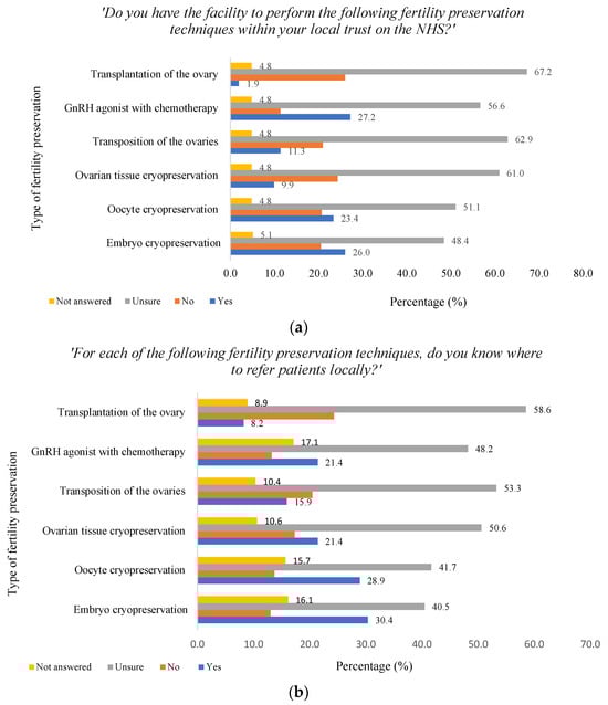 Knowledge of local fertility preservation services. (a) Knowledge of fertility preservation techniques within loacal trust. (b) Knowledge of referral to specialist unit.