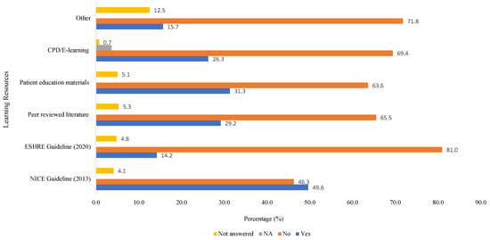 The majority (87.2%; n = 362) of participants had not experienced any formal training on FP compared to 9.4% (n = 39) who had, whereas 2.7% (n = 11) answered not applicable to the question and 0.7% (n = 3) did not answer. The majority (82.2%; n = 341) felt they personally needed more knowledge or formal training on FP options compared to 12% (n = 50), who felt this was not necessary, whereas 5.1% (n = 21) did not feel further knowledge and training was applicable to them and 0.7% (n = 3) did not answer. Overall the majority (74.2%; n = 308) felt their unit needed more knowledge or formal training on FP options compared to 12% (n = 50) who did not feel this was necessary, whereas 13% (n = 54) did not feel further knowledge and training was applicable to their unit and 0.7% (n = 3) did not answer. Figure 8 summarises the learning resources participants have consulted with in order to find further information about FP.