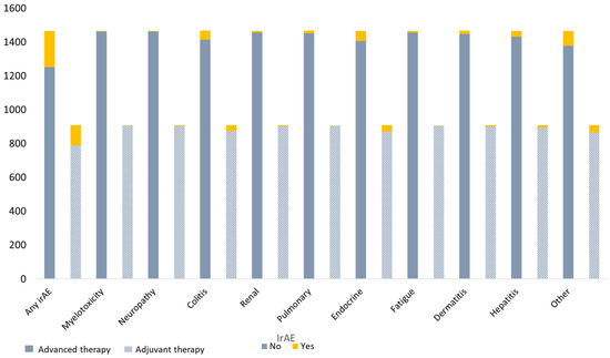 Any type of grade III-IV adverse event was seen in 214 (15%) advanced treated patients and in 119 (13%) adjuvant-treated patients (Table 3) (Figure 1), and this did not differ significantly between the two groups (p = 0.31). The incidence of specific irAEs (including myelotoxicity, neuropathy, colitis, renal, pulmonary, endocrine, fatigue, cutaneous, hepatitis, and other) was equally distributed among the two treatment groups, and the incidence ranged from 1 to 6%.