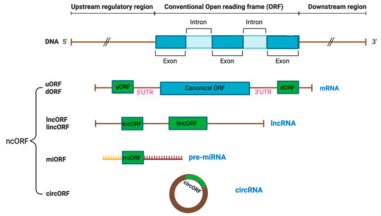 Technological advances have enabled the discovery of many neglected ncORFs, which are classified into different categories, such as long non-coding ORFs (lncORFs), circular ORFs (circORFs), intronic ORFs, primary microRNA-derived ORFs (pri-miORFs), and small ORFs (smORFs) (Figure 1) [1,3]. This section reviews ncORFs based on each category.