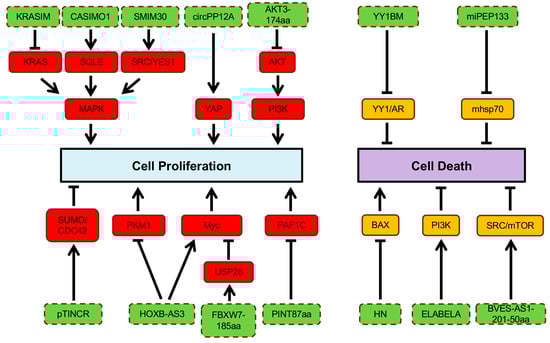 The apoptotic program can be initiated by various physiological signals, triggering a series of choreographed molecular steps involving in disruption of cellular membranes, cytoskeletal collapsing, chromatin condensation, and nuclear fragmentation [56]. The main apoptotic pathways are extrinsic and intrinsic as well as an additional T cell mediated perforin/granzyme pathway [71]. Although each pathway depends on specific activating signals, they converge on the same execution pathway triggered by caspase-3 activation [71]. Tumor cells can gain apoptotic resistance by expressing anti-apoptotic proteins (e.g., Bcl-2) or inhibiting proapoptotic proteins (e.g., Bax) [71]. Many peptides translated from ncORFs have been implicated in cell death regulation. For example, humanin (HN) inhibits apoptosis by preventing Bax translocation from cytosol to mitochondria (Figure 2) [72]. Inhibition of HN expression resensitizes the cells to Bax [72]. One of lncRNAs, BVES-AS1, encodes a short peptide, named BVES-AS1-201-50aa, which promotes cell viability by activating Src/mTOR signaling in CRC cells [73]. ELABELA is a 54aa peptide hormone that activates PI3K/AKT signaling via the apelin receptor to stimulate hESC growth and maintain self-renewal through inhibition of apoptotic pathways (Figure 2) [19]. Another lncRNA-encoded microprotein regulating cell viability is YY1-blocking microprotein (YY1BM) [74]. Under nutrient deprivation, YY1BM induces apoptosis by inhibiting the interaction of YY1 and androgen receptor in male esophageal squamous cell carcinoma (Figure 2) [74]. As previously described, pri-miRNAs, precusors of miRNAs, have been found to harbor ncORFs that encode functional peptides [28]. Microproteins encoded by these ncORFs are termed miRNA-encoded peptides (miPEPs). A novel miPEP, miPEP133, has demonstrated its tumor suppressive ability [75]. Overexpression of miPEP133 induces cell cycle arrest and apoptosis by blocking the interaction between mitochondaril heat shock protein 70 and its binding partner (Figure 2) [75].