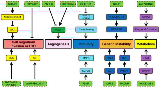 Regulation of cell migration/invasion, EMT, angiogenesis, immunity, genetic instability, and metabolism by ncORFs. Labels are as described in the legend of Figure 2.