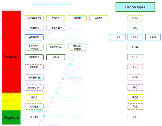 ncORFs as prognosis and diagnosis biomarkers. The prognostic and diagnostic roles of microproteins encoded by ncORFs in different human cancers is shown with dashed lines. AML, acute myeloid leukemia; BC, breast cancer; CRC, colorectal carcinoma; CSCC, cutaneious squamous cell carcinoma; GBM, glioblastoma; GC, gastric cancer; HCC, hepatocellular carcinoma; LAC, lung adenocarcinoma; NPC, nasopharyngeal carcinoma; OC, ovarian cancer; PC, prostate cancer; RCC, renal cell carcinoma.
