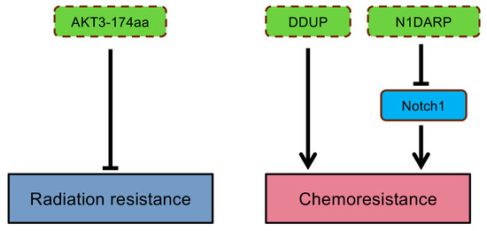 Drug resistance occurs when cancer cells tolerate a treatment, greatly limiting the efficiency of anti-tumor therapies in many patients [116,117]. Genomic instability is one factor contributing to drug resistance, which can be intrinsic or acquired [117]. Innate resistance exists in patients even before administrating anti-cancer drugs due to pre-existing genetic perturbations, tumor heterogeneity, or activation of defense mechanisms [117]. For example, resistance to cisplatin treatment was found in gastric cancer patients with HER2 overexpression, which upregulated the expression of EMT-related transcriptional factor Snail [118]. Moreover, studies show that Snail and Slug not only mediate EMT but also promote stem-like characteristics, conferring resistance to radiotherapy and chemotherapy [118,119]. Alternatively, relapse to treatment can occur when new mutations are acquired in tumor cells, resulting in a gradual decrease in therapy efficacy [117]. For instance, a point mutation from threonine-to-isoleucine in the BCR-ABL kinase domain can cause resistance or relapse of tyrosine kinase inhibitor treatment in patients with chronic myelogenous leukemia [120]. Several microproteins have been shown to affect drug efficiency in cancers (Figure 5). Radiation sensitivity was enhanced by overexpressing AKT3-174aa in GBM cells, while loss of AKT3-174aa expression regained resistance to radiation [67]. Chemoresistance can be acquired by evading DNA-damage-induced genetic instability [117]. DDUP is a lncRNA-encoded microprotein and functions as a regulator of DDR, promoting resistance to DNA-damaging chemotherapies [91]. Inhibition of DDUP by the ATR inhibitor Berzosertib re-sensitized ovarian cancer cells to cisplatin treatment, indicating its vital role in affecting drug response [91]. The tumor-suppressive role of a microprotein, N1DARP, was recognized in pancreatic cancer since it could suppress Notch1 signaling pathways, which contribute to chemoresistance [121].