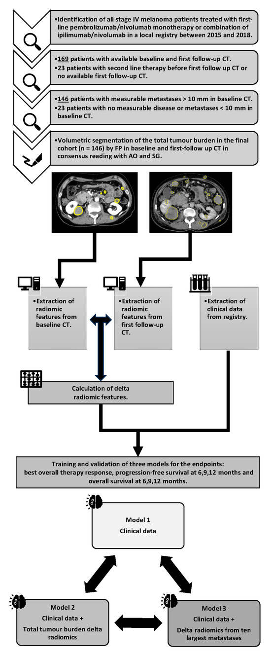 Peisen, F.; Gerken, A.; Hering, A.; Dahm, I.; Nikolaou, K.; Gatidis, S.; Eigentler, T.K.; Amaral, T.; Moltz, J.H.; Othman, A.E. Can Delta Radiomics Improve the Prediction of Best Overall Response, Progression-Free Survival, and Overall Survival of Melanoma Patients Treated with Immune Checkpoint Inhibitors? Cancers 2024, 16, 2669. https://doi.org/10.3390/cancers16152669