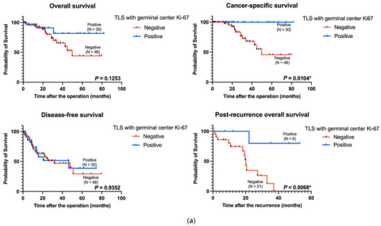 We explored the prognostic impact of mature TLS with germinal center Ki-67 expression using survival analyses of overall survival, cancer-specific survival, and disease-free survival in 78 patients with surgically resected pT4 CRC. CRC and mature TLS were significantly associated with prolonged cancer-specific survival (p = 0.0104) (Figure 2a). Moreover, patients with recurrent CRC (n = 29) with mature TLS had better post-recurrence overall survival than did those without mature TLS (p = 0.0068) (Figure 2a). The differences were not significant in terms of disease-free and overall survival (Figure 2a).