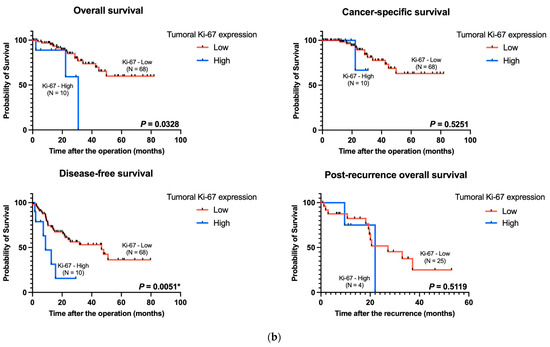 The high expression levels of tumoral Ki-67 were related to poor overall survival and disease-free survival in our cohort (p = 0.0328 and p = 0.0051, respectively) (Figure 2b). However, the difference was not significant in terms of cancer-specific survival and post-recurrence overall survival (Figure 2b).