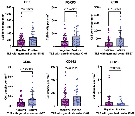 Relationship between immune cell infiltration and TLS maturity in 78 advanced pT4 CRC tissues. This figure compares the intratumoral infiltration levels of CD3+ (T-cell marker), FOXP3 (regulatory T-cell marker), CD8+ (cytotoxic T-cell marker), CD86+ (immune cells including M1-like macrophages), CD163+ (anti-inflammatory macrophage marker), and CD20+ (B-cell marker) immune cells between the negative and positive groups of mature TLS with Ki-67-positive proliferating germinal centers. TLS: tertiary lymphoid structure.
