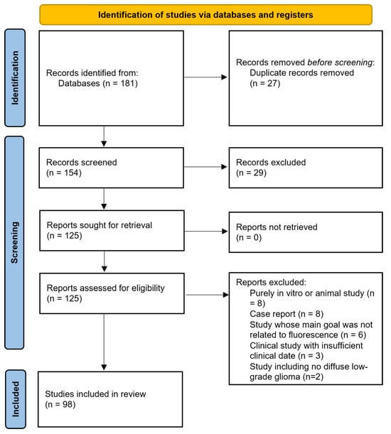 - Bianconi, A.; Bonada, M.; Zeppa, P.; Colonna, S.; Tartara, F.; Melcarne, A.; Garbossa, D.; Cofano, F. How Reliable Is Fluorescence-Guided Surgery in Low-Grade Gliomas? A Systematic Review Concerning Different Fluorophores. Cancers 2023, 15, 4130. [Google Scholar] [CrossRef]