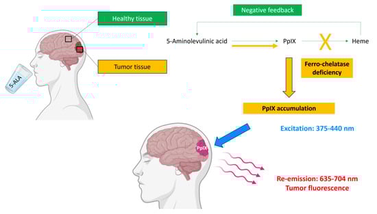 - Stummer, W.; Stocker, S.; Novotny, A.; Heimann, A.; Sauer, O.; Kempski, O.; Plesnila, N.; Wietzorrek, J.; Reulen, H.J. In Vitro and in Vivo Porphyrin Accumulation by C6 Glioma Cells after Exposure to 5-Aminolevulinic Acid. J. Photochem. Photobiol. B Biol. 1998, 45, 160–169. [Google Scholar] [CrossRef] [PubMed]