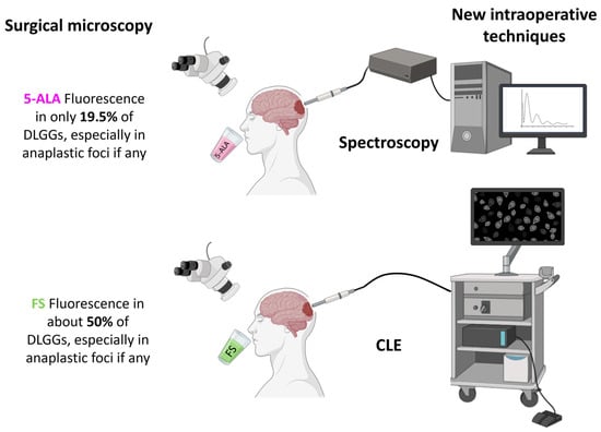 - Almekkawi, A.K.; El Ahmadieh, T.Y.; Wu, E.M.; Abunimer, A.M.; Abi-Aad, K.R.; Aoun, S.G.; Plitt, A.R.; El Tecle, N.E.; Patel, T.; Stummer, W.; et al. The Use of 5-Aminolevulinic Acid in Low-Grade Glioma Resection: A Systematic Review. Oper. Neurosurg. 2020, 19, 1–8. [Google Scholar] [CrossRef] [PubMed]