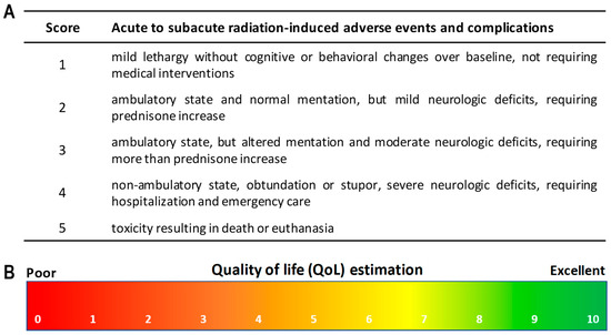 - Ladue, T.; Klein, M.K. Toxicity criteria of the veterinary radiation therapy oncology group. Vet. Radiol. Ultrasound 2001, 42, 475–476. [Google Scholar] [CrossRef]