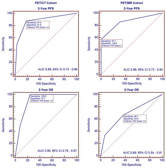 ROC curves were generated to evaluate the discriminatory ability of the PW score for 2-year disease progression and overall survival. As shown in Figure 1, the AUC values for 2-year disease progression were 0.88 (95% confidence interval (CI) 0.74–0.96; p < 0.001) in the PET/CT cohort and 0.86 (95% CI 0.73–0.94; p = 0.001) in the PET/MR cohort. For 2-year overall survival, the AUC values were 0.90 (95% CI 0.76–0.97; p < 0.001) in the PET/CT cohort and 0.69 (95% CI 0.54–0.81; p = 0.338) in the PET/MR cohort.