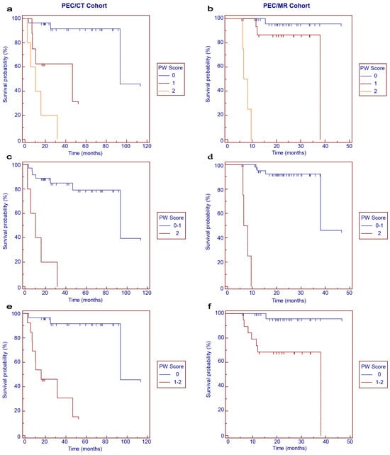 Kaplan–Meier survival curves for progression-free survival in the PET/CT (a,c,e) and PET/MR (b,d,f) cohorts according to PW scores.