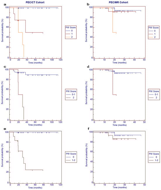 During the follow-up period, disease progression occurred in 12 patients (29.3%) and 8 patients (16.3%) of the PET/CT and PET/MR cohorts, respectively. The survival curves for PFS according to the PW scores are shown in Figure 2. In general, worse PFS was correlated with higher PW scores (Figure 2a,b, p < 0.001). When the 3-point scale was categorized into binary subgroups, PW score 2 was significantly associated with worse PFS in the PET/CT cohort (Figure 2c, p < 0.001) and PET/MR cohort (Figure 2d, p < 0.001) compared with PW score 0–1. Similarly, patients with PW score 1–2 had significantly worse PFS in the PET/CT cohort (Figure 2e, p < 0.001) and PET/MR cohort (Figure 2f, p = 0.004) than those with PW score 0.