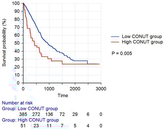 Figure 2 shows the Kaplan–Meier survival curves according to the CONUT score groups. The log-rank test indicated that the survival probability of the low CONUT score group was significantly higher than that of the high CONUT score group (p = 0.005).