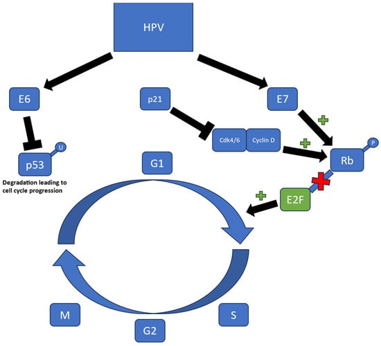 Part of the papillomaviridae family, HPV is classified as a non-enveloped double-stranded DNA virus []. HPV mainly infects either squamous and/or mucosal epithelium, particularly mucosal surfaces of the oropharyngeal and anogenital tract. HPV is known to cause a wide range of diseases including benign warts and papillomas, as well as genitourinary and head and neck cancers. The virus encodes two proteins, E1 and E2, that are responsible for DNA replication and it relies solely on cellular host machinery for the additional resources needed []. However, terminally differentiated keratinocytes lack the replicative machinery to advance from the G1 to the S phase, which would impact the virus’s ability to survive and maintain its proliferative state []. In order to circumvent this issue, HPV infects the basal layer of the epithelium and prevents terminal differentiation of keratinocytes through viral oncogenes E6 and E7 (Figure 1). The mechanism by which they maintain proliferative capacity is mainly studied in HPV-16 and HPV-18, two “high-risk” viruses with association for malignant potential. E6 was found to specifically degrade p53, a tumor suppressor gene, via a ubiquitin-dependent protease process [,]. Conversely, E7 binds to the unphosphorylated region of retinoblastoma (Rb), which subsequently releases the transcription factor E2F; thus abrogating the tumor suppressive effects and allowing for progression of the G1 to S phase of the cell cycle [,]. p16, also known as major tumor suppressor 1, binds cdk 4/6 and prevents association with cyclin D, preventing phosphorylation of Rb []. Under normal conditions, p16 functions to inhibit cell cycle progression, however, in the presence of HPV-associated E7 oncoproteins, p16 is unable to function and this inhibition is lost []. Therefore, p16 expression has been used as an important surrogate for HPV-associated cancers, although this is not a definitive correlation since multiple molecular pathways regulate p16 expression levels. Conversely, patients with head and neck cancer who have a history of tobacco and alcohol use have tumors that exhibit downregulation of p16 expression and this usually predicts a poor outcome [].