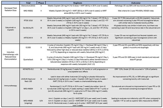 RTOG 91-11 was one of the first studies utilizing induction chemotherapy in laryngeal cancer []. In this study, induction was accomplished with cisplatin and 5-FU prior to definitive radiation. The primary outcome, laryngeal preservation, was ultimately inferior to the chemoradiation arm and was not significant when compared to RT alone. However, HPV status was unknown at the time. The first trial to demonstrate the correlation between HPV-positive status and PFS with induction chemotherapy was shown in the E2399 trial []. This ultimately led to the E1308 trial, a phase II study aimed and determining whether reduced-dose radiation can lower toxicity while maintaining comparable PFS []. This trial was designed to administer three cycles of induction cisplatin, paclitaxel, and cetuximab followed by either high-dose or reduced-dose (69 Gy vs. 54 Gy) radiation with weekly cetuximab depending on response with induction therapy. Patients who had a complete clinical response at the primary site as determined by radiographic imaging carried out within 14 days post-induction therapy were assigned to the reduced-dose radiation arm. Overall, the 2-year PFS (80%) and OS (94%) were relatively encouraging with the reduced-dose arm. Moreover, patients on the reduced-dose arm had fewer grade 3 toxicities including mucositis and dysphagia. This ultimately led to the Quarterback trial, which aimed to use reduced-dose chemoradiation in patients who responded to induction chemotherapy []. Overall, the 3-year PFS and OS was >80% in both groups and overall comparable, although comparing between standard and reduced dose was difficult to interpret as it was a small study with only 22 eligible patients. A follow-up of three sequential studies as part of the Quarterback trials was recently presented at the American Society of Clinical Oncology (ASCO) in 2023, which showed that the reduced-dose chemoradiation regimen maintained potency with improved quality of life [].